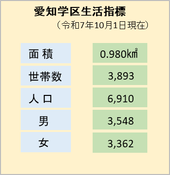 愛知学区は、名古屋駅より南西2.5キロメートル、中川区の最北端に位置し、北は名古屋都市高速道路(昭和61年10月27日開通)を境界として中村区に隣接、東は中川運河、南は旧佐屋街道、西は黄金陸橋から南へ下がる名古屋環状線周辺部に囲まれ、愛知小学校を中心に神社、寺院、住宅、工場、高層住宅(豊成団地)からなる地域である。