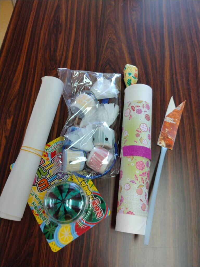 トイレットペーパーの芯の吹き矢、牛乳パックの竹とんぼ、ヨーヨー等)をお渡しさせて頂きました